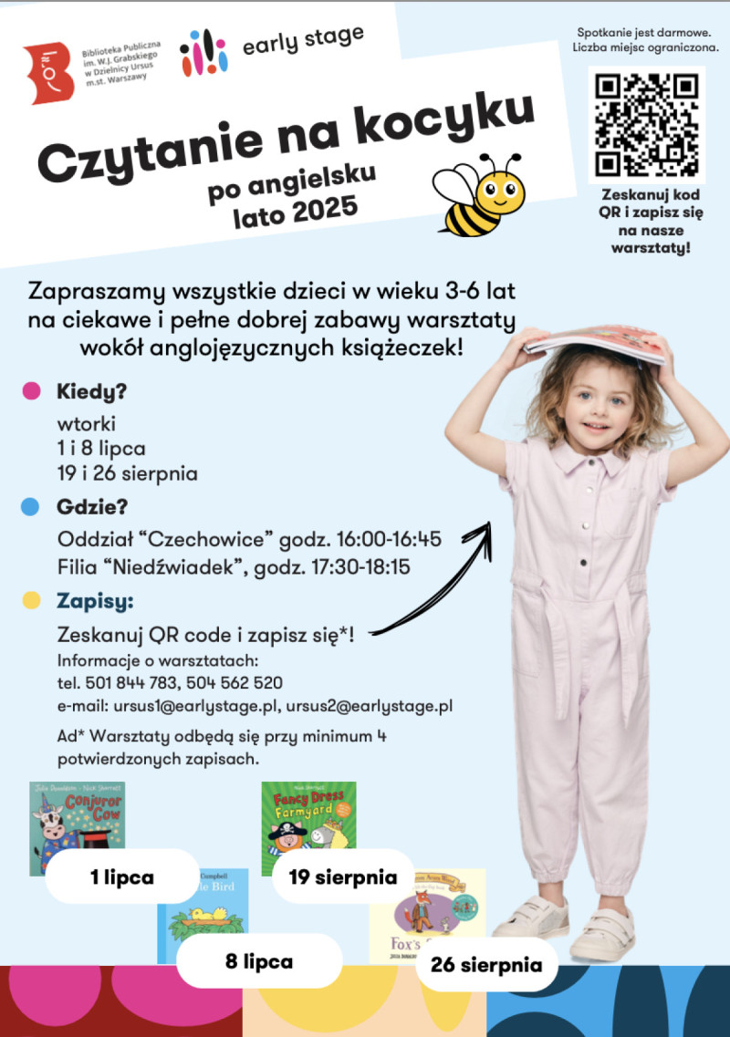 "Czytanie na dywanie" to wspólny projekt naszej filii Early Stage Ursus 1 i Biblioteki Publicznej w Dzielnicy Ursus skierowany do wszystkich dzieci w wieku 3-6 lat mieszkających na terenie naszej dzielnicy. Na każdym spotkaniu towarzyszy nam inna książeczka oraz mnóstwo gier i zabaw językowych; dzieci wykonują też projekt plastyczny. Po spotkaniu zachęcamy do skorzystania z bogatego księgozbioru Biblioteki: mali czytelnicy znajdą tam mnóstwo ciekawych książeczek i po angielsku i po polsku!